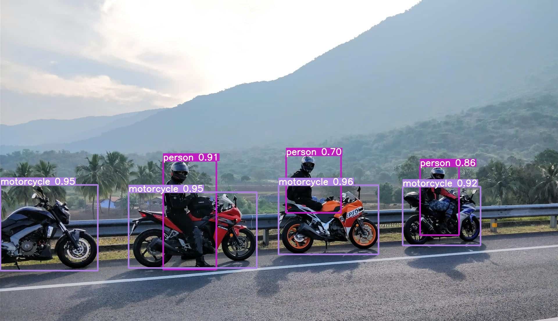 YOLOv8 quantization model identifies vehicles, pedestrians, and cyclists. Bounding boxes are generated with confidence scores exceeding 85%.